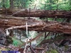 Serge Renggli: Eigentlich sind es gleich mehrere Brücken, die aber alle etwas gemeinsam haben. Sie sind alle verfallen. Es handelt sich um einen, eigens für den Abtransport von geschlagenem Holz erstellten Brückenwege im Umghitenwald. Die Bilder sind stumme Zeugen dieses sicherlich mal äusserst beschwerlichen Unterfanges. Um 1945 gabe es im Gebiet Riebenwald ( 653177/184465 ) einen grossen Holzschlag. Von dort wurde das geschlagene Holz den Hang runter bis zum Altibach (653261/184971) geführt. Vom Altibach bis zur Strasse ( 653522/185240) wurde für den Weitertransport des Holzes eigens ein Brückenweg waagrecht im Hang des Umghitenwaldes (Haslichile) gebaut. Indessen sind die Holzbrücken verfallen.Ein paar Rundholzauflager, gespickt mit Eisen, die damals die Querbohlen befestigten, sind stumme Zeugen dieses ehemaligen Brückenweges (Holzreistpfades).