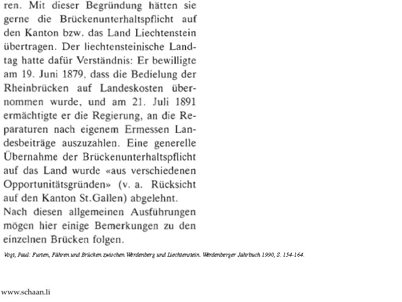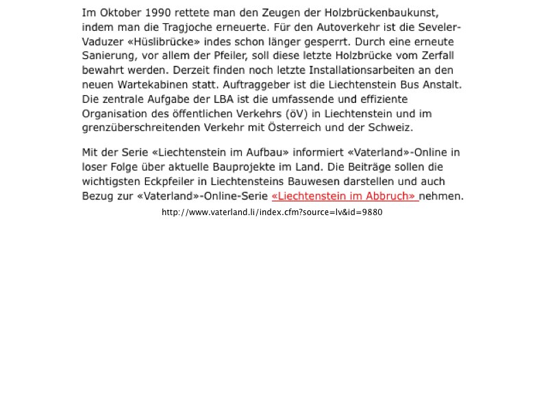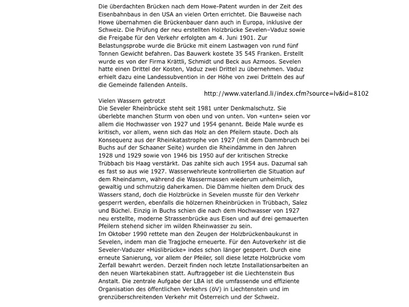 | Zusätzliche technische Informationen | "Vielen Dank an Eva Pepic: Die Renovation der Holzbrücke Vaduz-Sevelen wurde vor gut einundhalb Monaten fertig gestellt. Ich schicke Ihnen dazu ein pdf des Presseberichtes aus dem „Liechtensteiner Vaterland“ vom 1. Juli 2011. Vielleicht können Sie es ja für Ihre website gebrauchen. " |