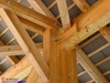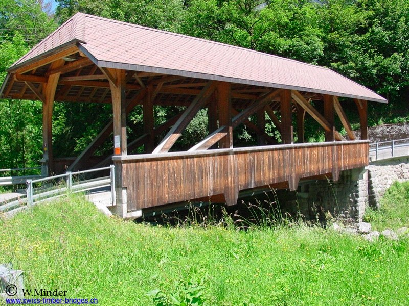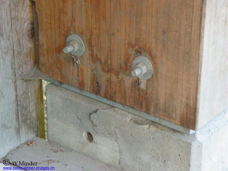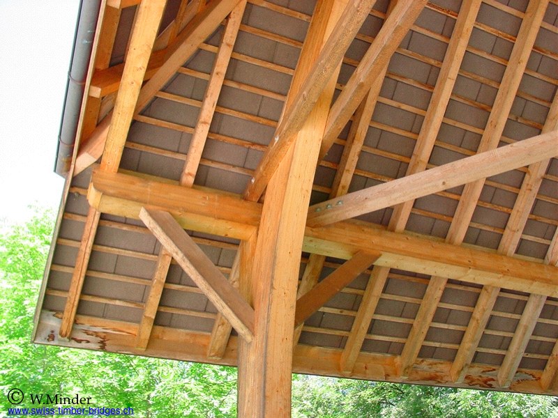 Krüppelwalmkonstruktion mit gebogenen Giebelwandbinder zur Windaussteiffung, sonst alles in vereimter geradener Leimkonstruktion. Einige Risse in dem Beton sind sichtbar.