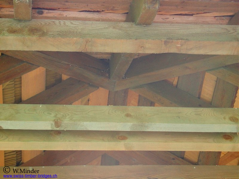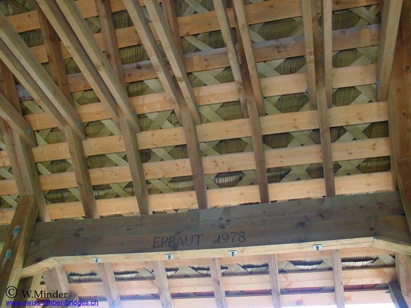 Krüppelwaldach ohne First, wie dies früher im Emmental oft gemacht wurde. Schöne fachmännische Konstruktion mit einigen Inschrifte. Diese Brücke überspannt die noch relativ junge Emme.