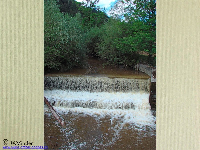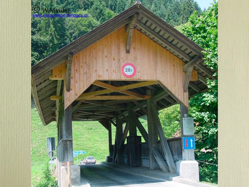 Dieses schöne Hängewerk trägt ohne weiteres die Postautos, welche oft jeden Tag darüber fahren. Diagonalschalung hilft die Schubkräfte gut verteilen. Hier wurde ein Asphaltbelag darübergegossen, zu besseren Haftung wenn das Holz nass ist.